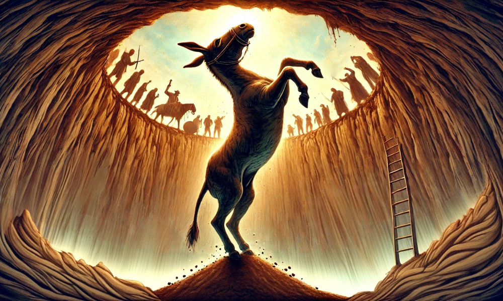 Sin embargo, en lugar de dejarse hundir, el burro encuentra una solución creativa: utiliza cada palada como una oportunidad para levantarse, sacudiéndose la tierra y subiendo un poco más. Su perseverancia y capacidad de adaptarse le permiten salir del pozo y liberarse.